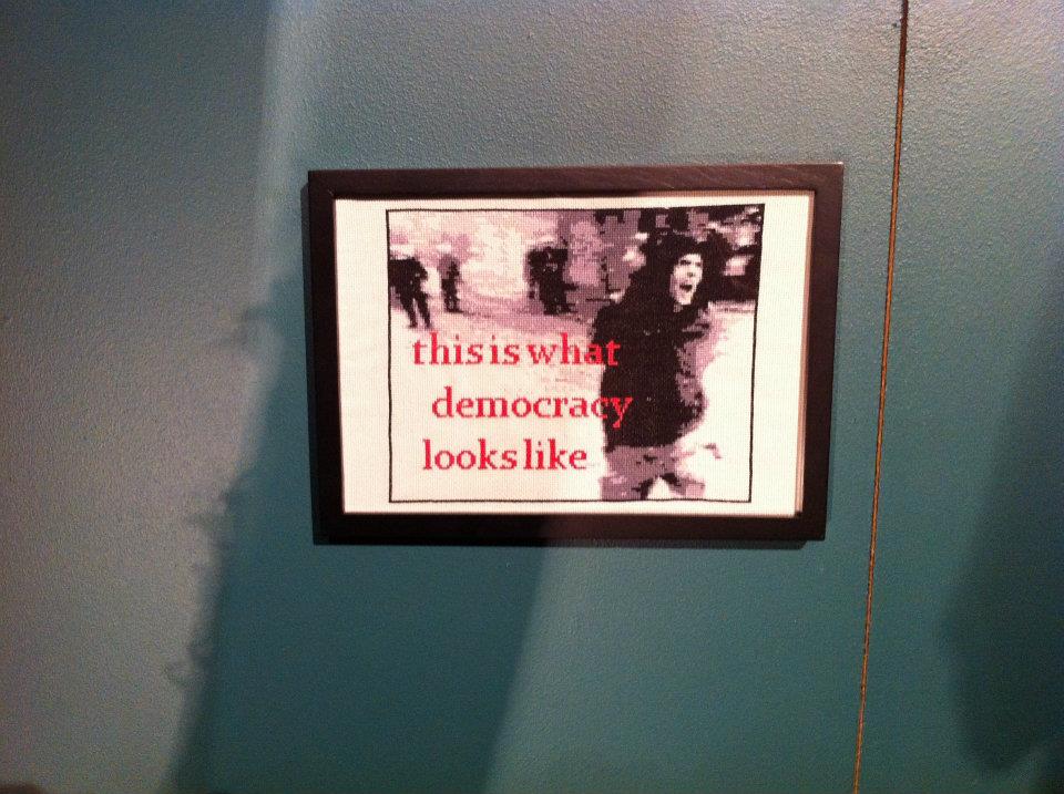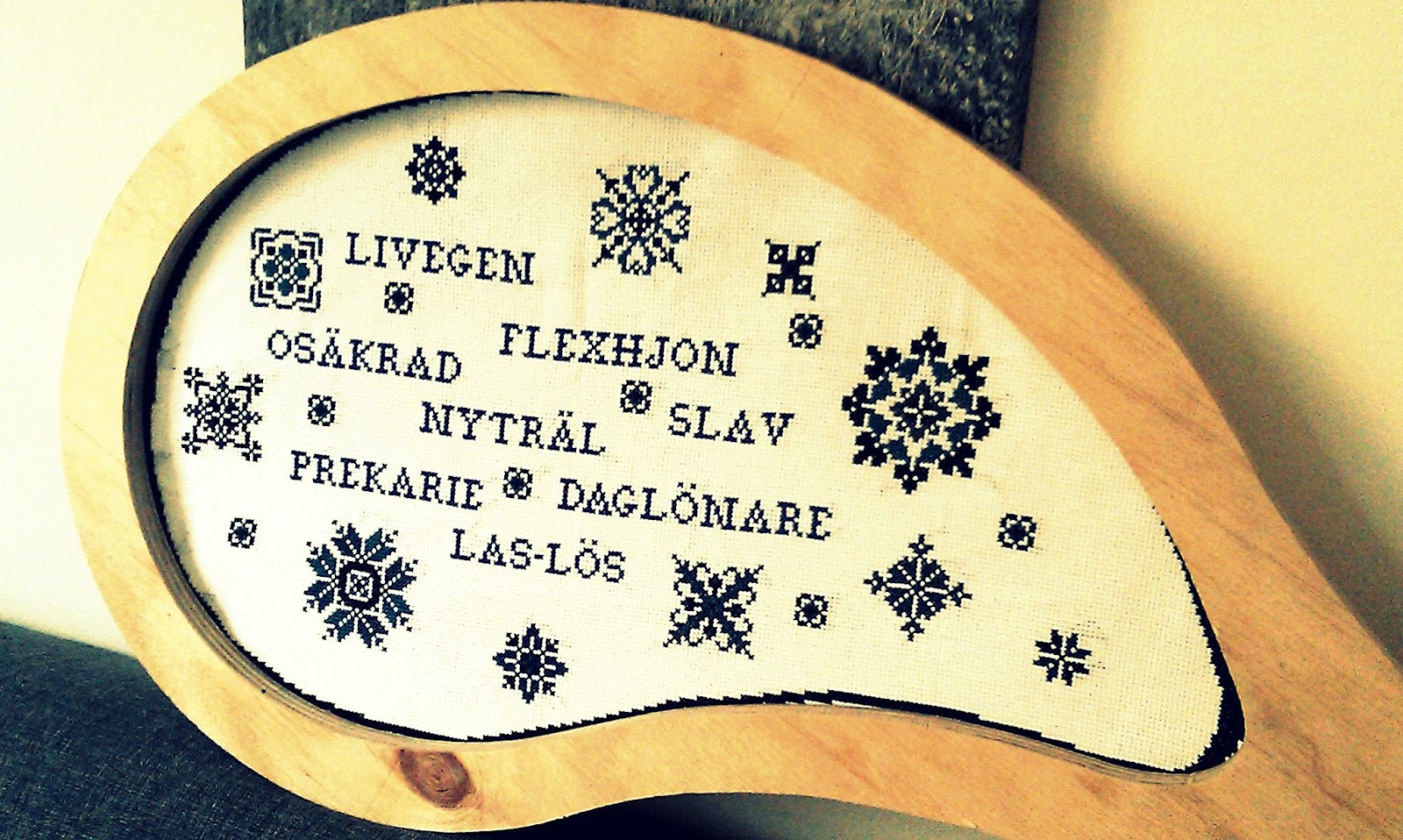 This in turn sparked the flame in some temp workers, that got together & launched a counter campaign, also called Vi kallar oss (but with a slighty different url). Here all the suggestions that weren't welcome in the original contest were collected & voted on. The catchphrase for the site was (still is) 'What we call ourselves, not what the agencies wants us to be called', & in a couple of days this new site had totally hijacked the original campaign (that closed down due to the shitstorm it got caught up in). The words in my cross stitch are choosen from the suggestions of this counter movement; day labourer, slave, flex servant, insecured, serf, precariuos, & so on...